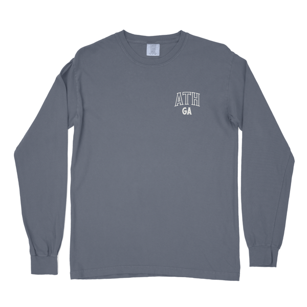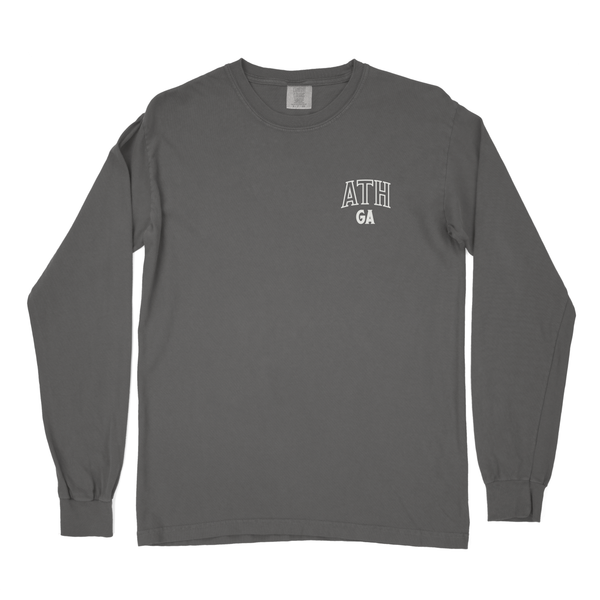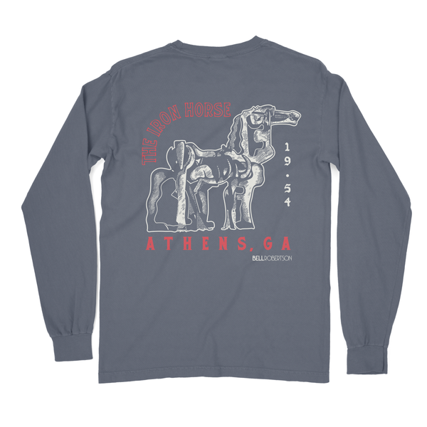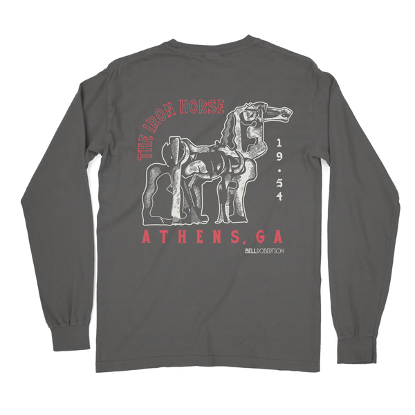 Experience the iconic IRON HORSE sculpture with our Long Sleeve T-Shirt, featuring the legendary work of Abbott Pattison commissioned in 1954 for the University of Georgia. The sculpture now resides on the Iron Horse Plant Sciences Farm just outside of Watkinsville, Ga and is a local landmark visited by large numbers of tourists every year. This original Bell Robertson designed tee represents the city of Athens and our beloved hometown university. As always, the front logo displays "ATH GA"